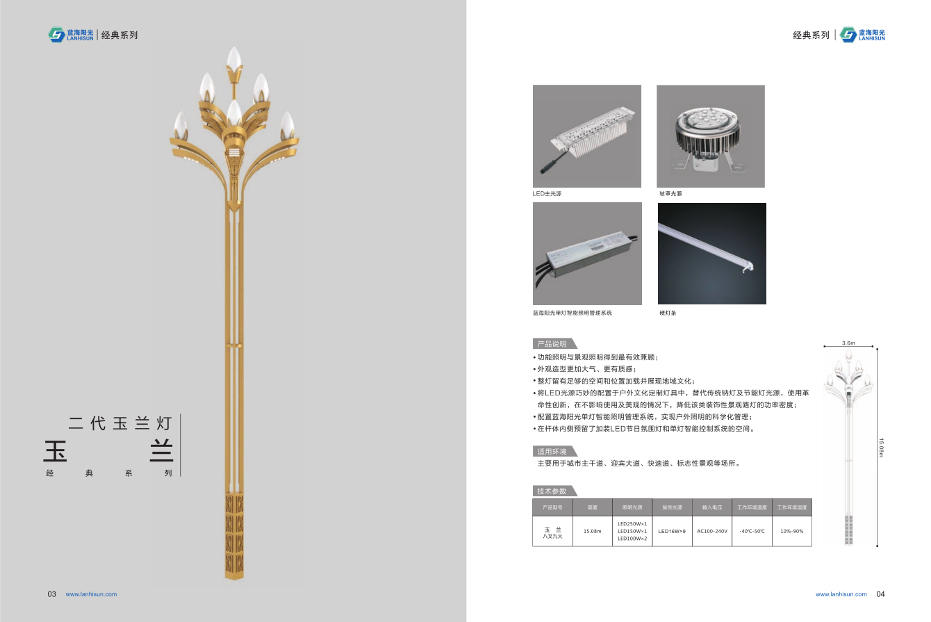 1、高度為6-16米; 2、花葉光源為4組LED光源,色溫2500-6500K,燈罩光源為9只LED裝飾光源,每個光源功率為30-60W; 3、LED驅(qū)動電源壽命可達(dá)五年; 4、整體熱鍍鋅噴塑,保證燈桿15年不生銹; 5、可以根據(jù)使用地區(qū)的地域文化、產(chǎn)業(yè)特點(diǎn)等進(jìn)行文化定制;