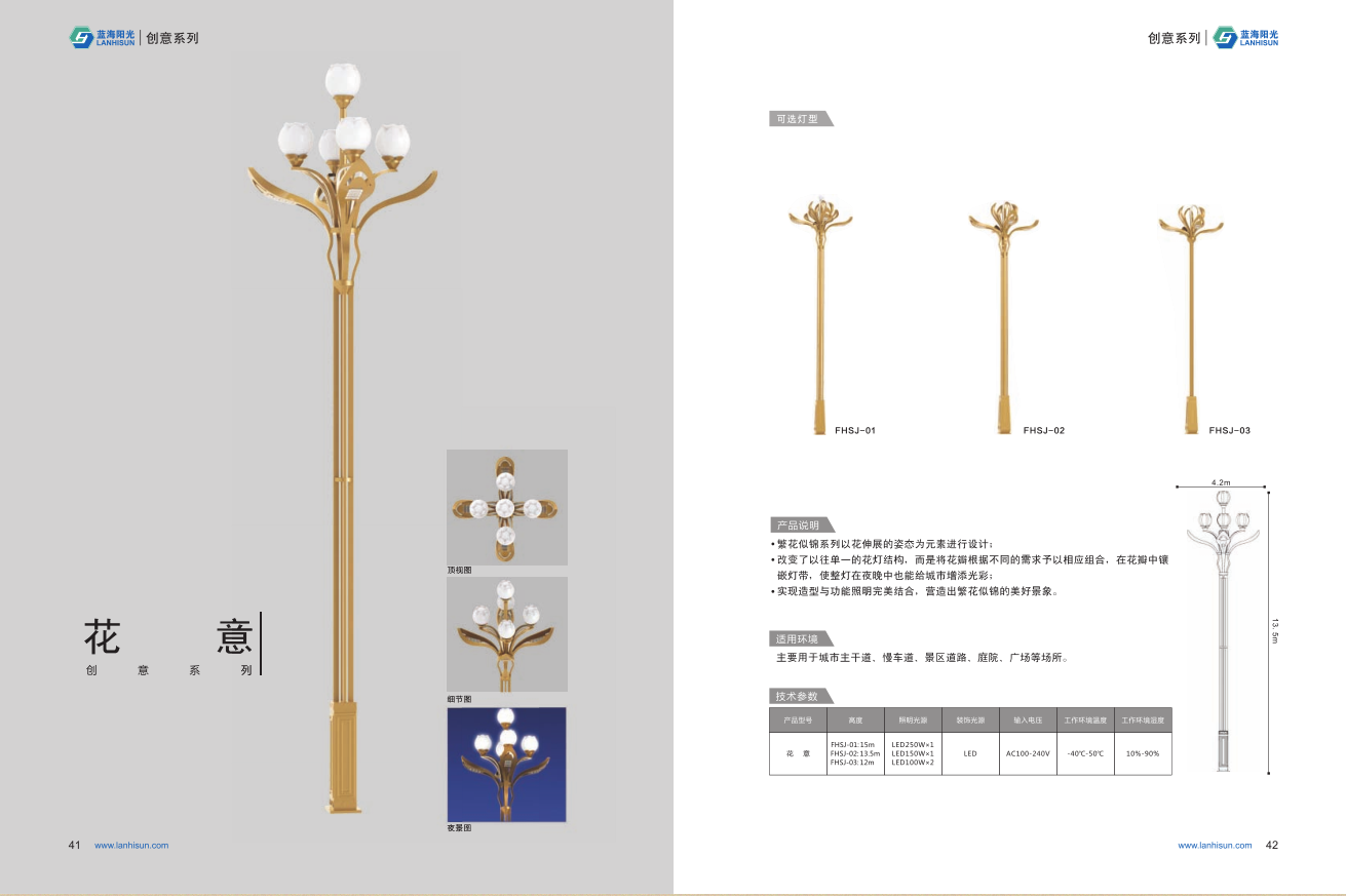 1、高度為6-16米; 2、花葉光源為4組LED光源,色溫2500-6500K,其余光源為LED裝飾光源,每個光源功率為30-60W; 3、LED驅(qū)動電源壽命可達五年; 4、整體熱鍍鋅噴塑,保證燈桿15年不生銹; 5、可以根據(jù)使用地區(qū)的地域文化、產(chǎn)業(yè)特點等進行文化定制;