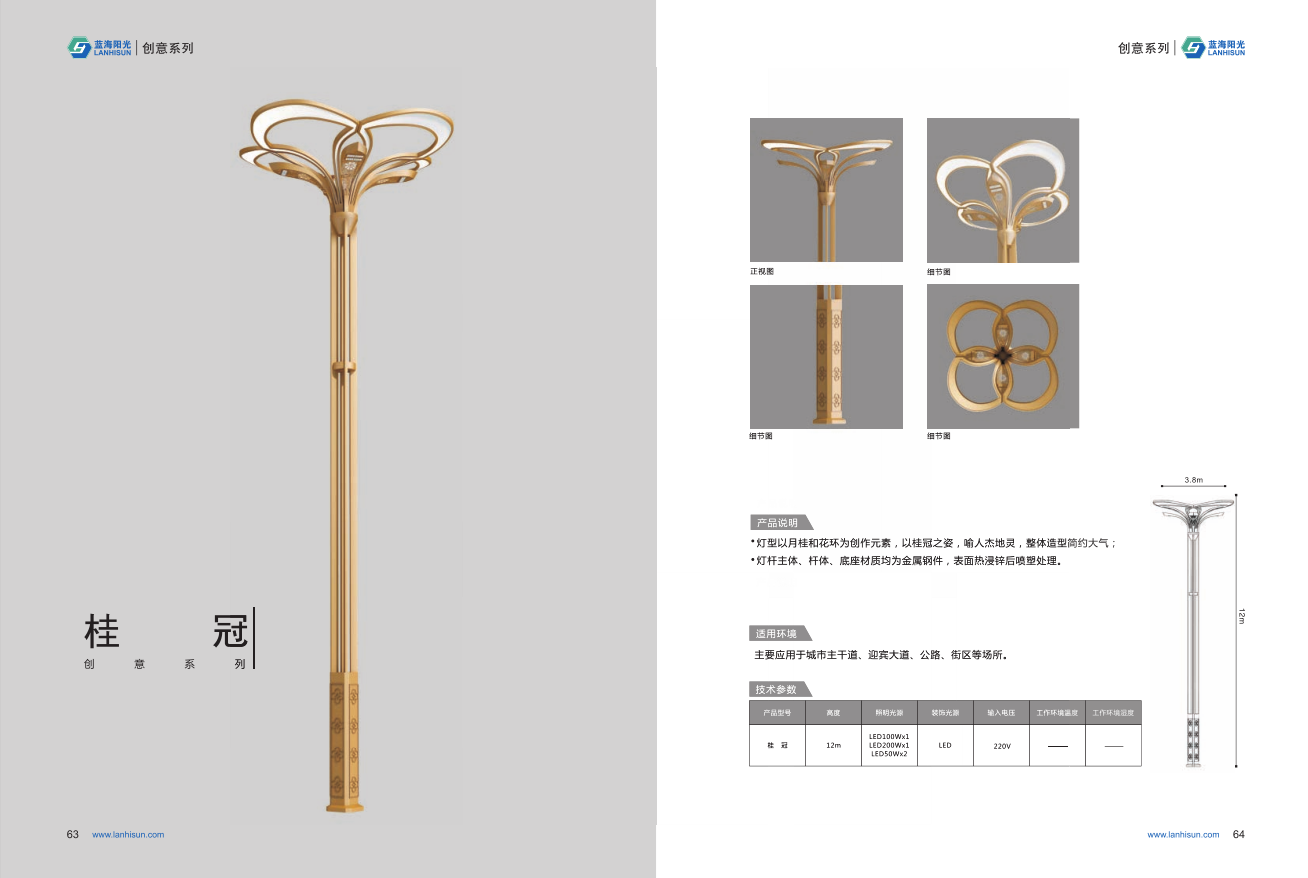 1、高度為6-16米; 2、花葉光源為4組LED光源,色溫2500-6500K,其余光源為LED裝飾光源,每個光源功率為30-60W; 3、LED驅動電源壽命可達五年; 4、整體熱鍍鋅噴塑,保證燈桿15年不生銹; 5、可以根據使用地區的地域文化、產業特點等進行文化定制;